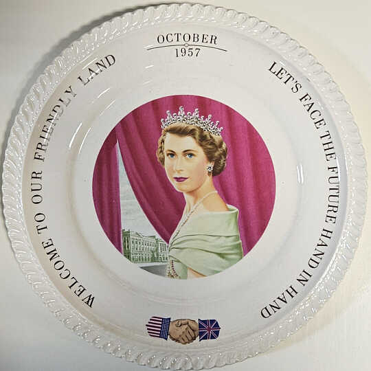 The decal was used again on Harker plates in 1957 to commemorate the first royal visit to the United states.