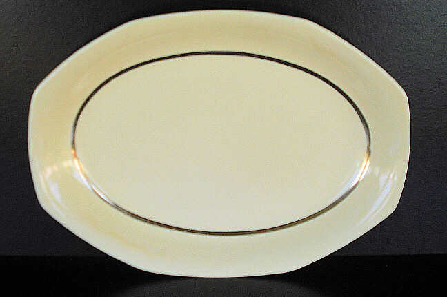 The "Second Selection" marking was used on Homer Laughlin wares in the early to mid 1930s. It was an overstamp mark in either gold or platinum that was applied to pieces after they were glazed and fired, but before they received decals, gold trim, platinum trim, or other decorative elements. If a piece did not fit the schematic required for first quality, then it was sometimes given this special mark. Such pieces would have imperfections involving the glaze such as runs, drips, discolorations, misses, bumps, bubbles, and/or kiln dirt.