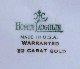 There was also an 11" service plate. Both the 10" and the 11" sizes were decorated with colored rims, center floral decals, and elaborate gold stampings. These are almost always marked with a 22 Carat Gold stamp in addition to the regular HLC mark. Like the NYWF plates, floral service plates can be found with blotted out Expo markings.
