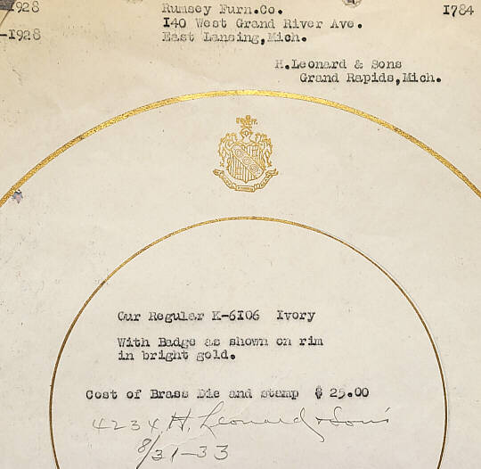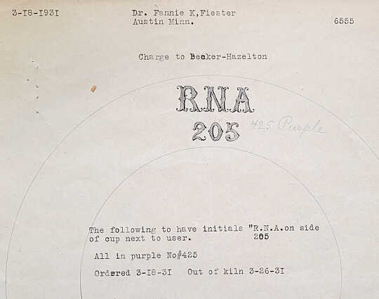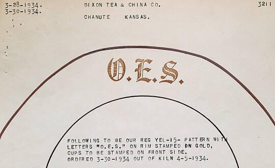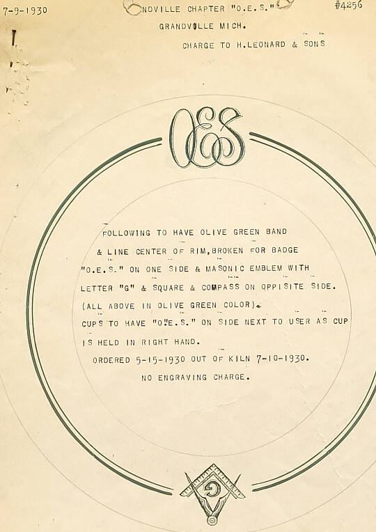 If an emblem like the Masonic symbol or the Order of the Eastern Star's monogram were used often, then there was no extra charge for creating an engraving to make the underglaze prints necessary for the treatment. On the other hand, if a new engraving had to be made, then there was almost always an added engraving charge. The same was true for gold stamps, however the cost to make a new rubber stamp for gold decorations was much lower than making a new engraving for underglaze prints.