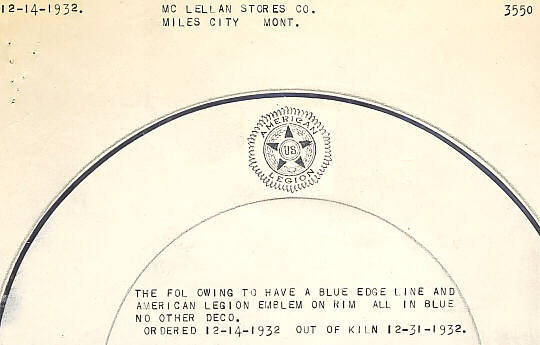 In the early 1900s, the Homer Laughlin China Company filled special orders using their hotel and dinnerware lines. These included orders from churches, college fraternities, hospitals, Masonic lodges, American Legion groups, various clubs, and some department stores celebrating anniversaries. The decorations often included an emblem with simple lines with no further ornamentation.
