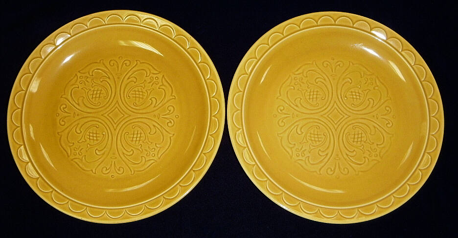 The St. Regis "Sun Gold" line of dinnerware was first offered by Mobile Dealers in the summer of 1969. It was made up of Granada shapes which had been developed two years prior in the summer of 1967. However, four pieces were specially created for St. Regis in August and October of 1968. They were listed in company records as 'Granada Intaglio' and include the dinner plate, 7" plate, chop plate, and oval platter. As the intaglio name implies, each of these four pieces was given a large etched design. This eliminated the need for any other decoration such as underglaze stamping, transfers, or decals.