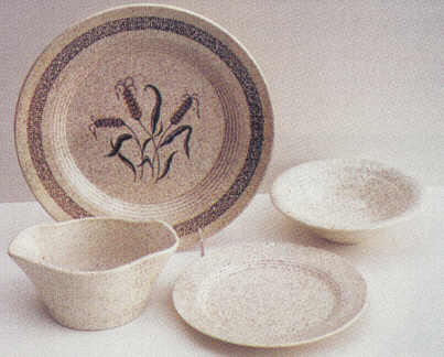 All the pieces of Homestead Dinnerware received a specked "Country Sage" glaze. Dinner plates could be purchased with or without the berry or wheat treatments. Plates are generally marked with an HLC backstamp and two digit date code. Some hollowware can be found with a USA mold marking.