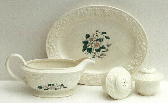 Plates and cups with slip decoration were made in early October 1938 and were listed in the log as having, "Wedgwood embossed work." For the rest of the month and into December, more pieces of the new shape were made including nappies, various styles of teacups, plates, patters, and saucers. The raised sprigs would also undergo several changes resulting in varying widths. By the end of November, Rhead was referring to the new line as "Theme."