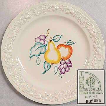 Theme Eggshell was discontinued in the 1950s. Almost every decoration encountered will be floral decals, though there are some platinum and gold band decorations as well as several rare examples of solid colored glazes.