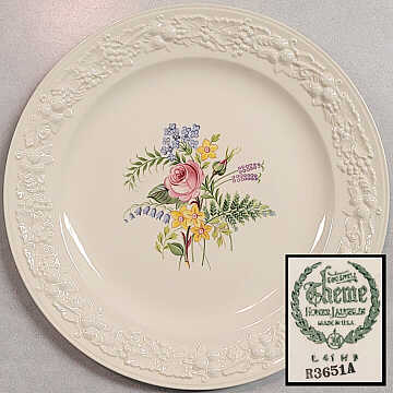 A few late additions were made to the Theme shape. The teapot was created in the Fall of 1940 and would undergo a change in the shape of its spout in June 1942. The last standard piece add the square plate which was released into production on May 7, 1941. Several backstamps were created for Theme, but only two were used. The first was a stylized Theme logo with quarter circle -- an example is on the far right. It was quickly replaced by the common wreath-Theme marking.