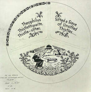 Most, if not all, of Charles William's drawings for this series are featured in Jo Cunningham's book, Homer Laughlin China 1940s & 1950s, © 2000, pages 150 to 156. To the right is Tongue Twister concept art drawn by Frederick Rhead.