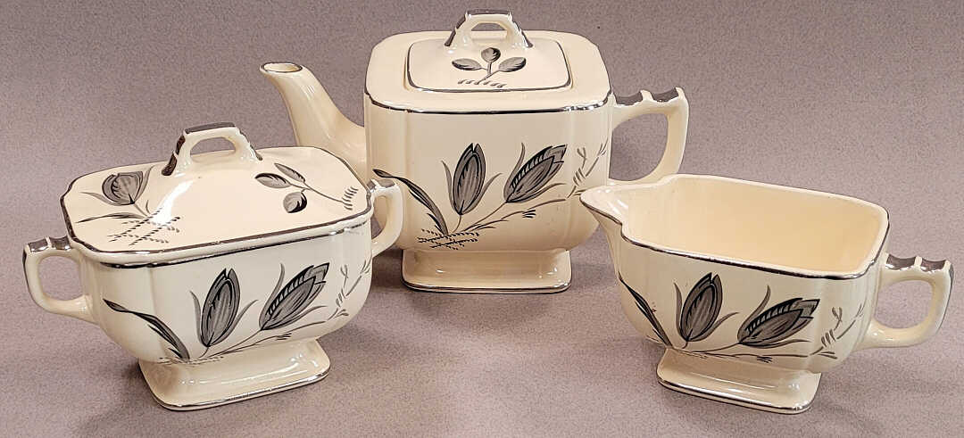 Black Tulip is a very popular and collectible pattern made by the Homer Laughlin China Company during the 1930s. It originated on the Century shape, but was also used on Wells, Jade, and Nautilus. Of the four, Nautilus examples are the most difficult to find.
