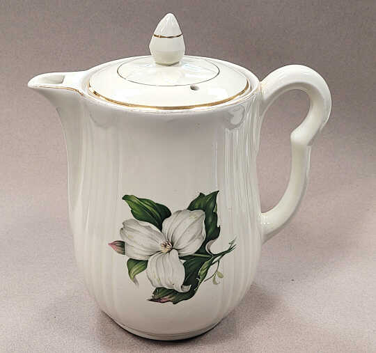 The trillium decal was originally used by American Limoges on various shapes with patterns names L'Tiomphe and Glamour. After American Limoges closed in the mid-1950s, the decals became available to smaller decorating firms.