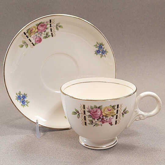 - First used on the Georgian Ivory (Craftsman) shape with platinum trim and black fine lines G-109 "Cynthia", circa mid-1930s