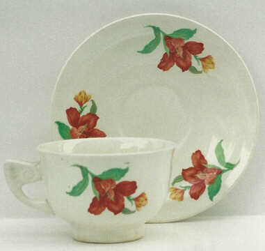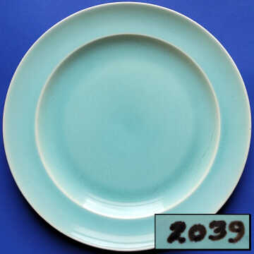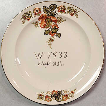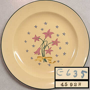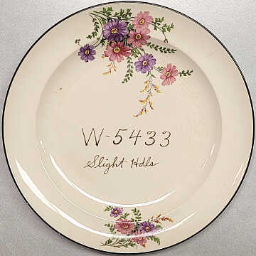 Decaled Wells will be marked in one of several ways; a Vellum backstamp, a general HLC marking, or a Wells Peacock mark. Three different peacock marks exist - a multicolored decal, a gold stamp, and a platinum stamp. This is also a case with the Georgian (Craftsman) backstamps and it has been learned that the multicolored mark was used for more expensive patterns and the gold stamp for cheaper ones. The peacock mark can also be found on Century and, to a lesser degree, Jade. Some argue that the peacock mark was used on anything with the Vellum glaze, but this isn't always the case as ivory (a white glaze not to be confused with vellum or Fiesta's old ivory) pieces of Wells can be found with the Wells backstamp. Instead of being a Vellum mark, it seems more likely the marking was used for more "top shelf" treatments - regardless the glaze and shape. The special marking was no longer in used by the mid-1930s.