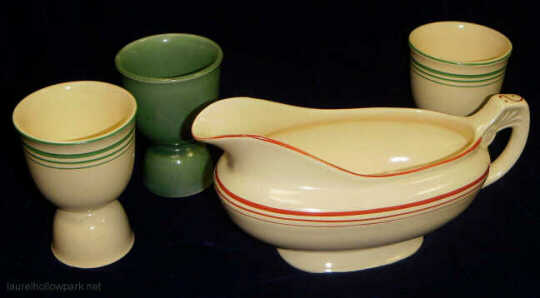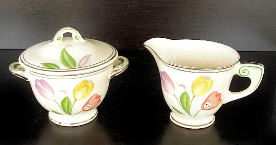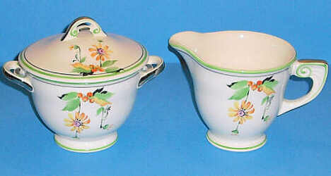 Homer Laughlin introduced the Wells shape in 1930. Hollowware was given applied finials and handles with little scroll decorations and the flatware consisted of plain round rim shapes. These flat piece differed from HLC's other lines such as Empress and Kwaker in that Wells' rim was much more concave and thinner. There is at least one creamer marked Made In Japan that is almost identical to the Wells version. Whether Frederick Rhead created the Wells hollowware based on this import or it if was the other way around isn't certain.
