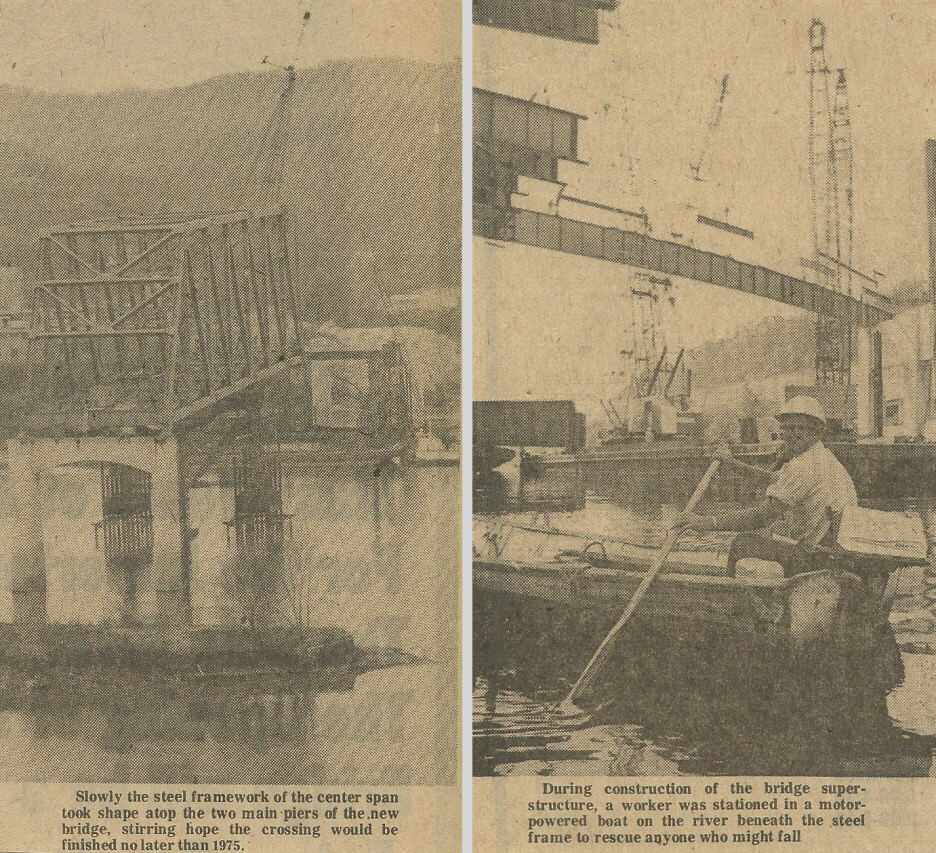 By the end of January 1974, the main span was almost complete and work began on the piers and ramps on the Ohio side. On August 2, 1974, construction began on the concrete approach piers on the West Virginia side.