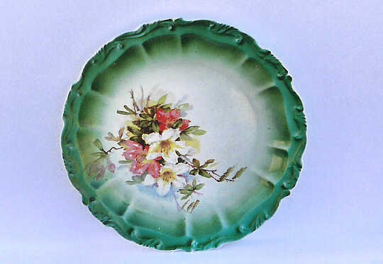 Most of the decorations used involved blended tints of various shades with decals of fruits, figures, or flowers. Earlier pieces were decorated with gold trim or gold stipple, whereas later pieces relied more on the blended tints.