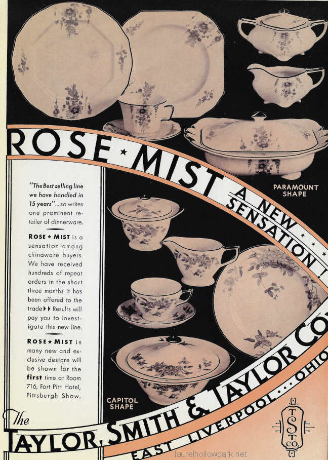 In 1931, Rose Mist - pink bodied ware with clear glaze - was used on Capitol, Paramount, Regal, and Washington. Capitol was discontinued shortly after TS&T started using Rose Mist. The plain round Laurel shape replaced Capitol in 1932.