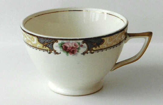Capitol was first produced in the very late 1920s. The round flatware was made with wide rims and the hollowware was made in a top-heavy conical form. Teacups and creamers were given angular handles whereas other pieces such as the sugar bowl had small tab handles. The majority of decorations used on Capitol were ribbon or "border" decals limited to the rim.