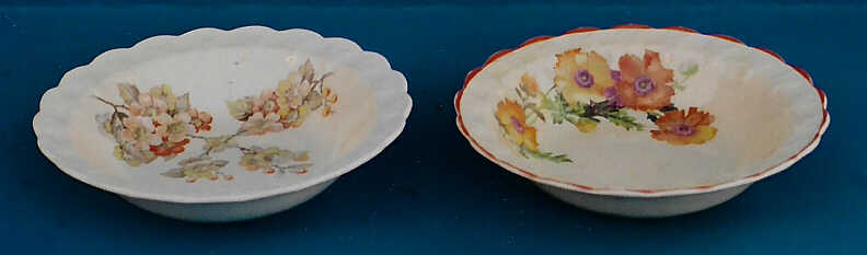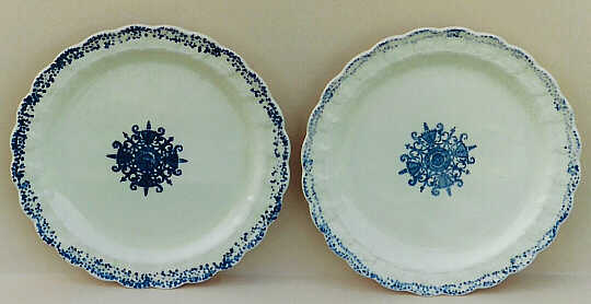 Garland was produced mainly with decals and monochromatic underglaze prints. "English Abbey" was one such print and was came in a wide array of colors including pink (red), blue, green, black, brown, and mulberry. Garland was also made in the pink Rose Mist clay. In this case, the clay itself was pink and the glaze clear. Rose Mist is much more common with Paramount, Regal, and Plymouth shapes. Garland in Depression era green glaze is somewhat rare. To the right is the green glaze on a Garland plate along with a Fairway creamer. (Photo courtesy Fran and Carl Stone.)